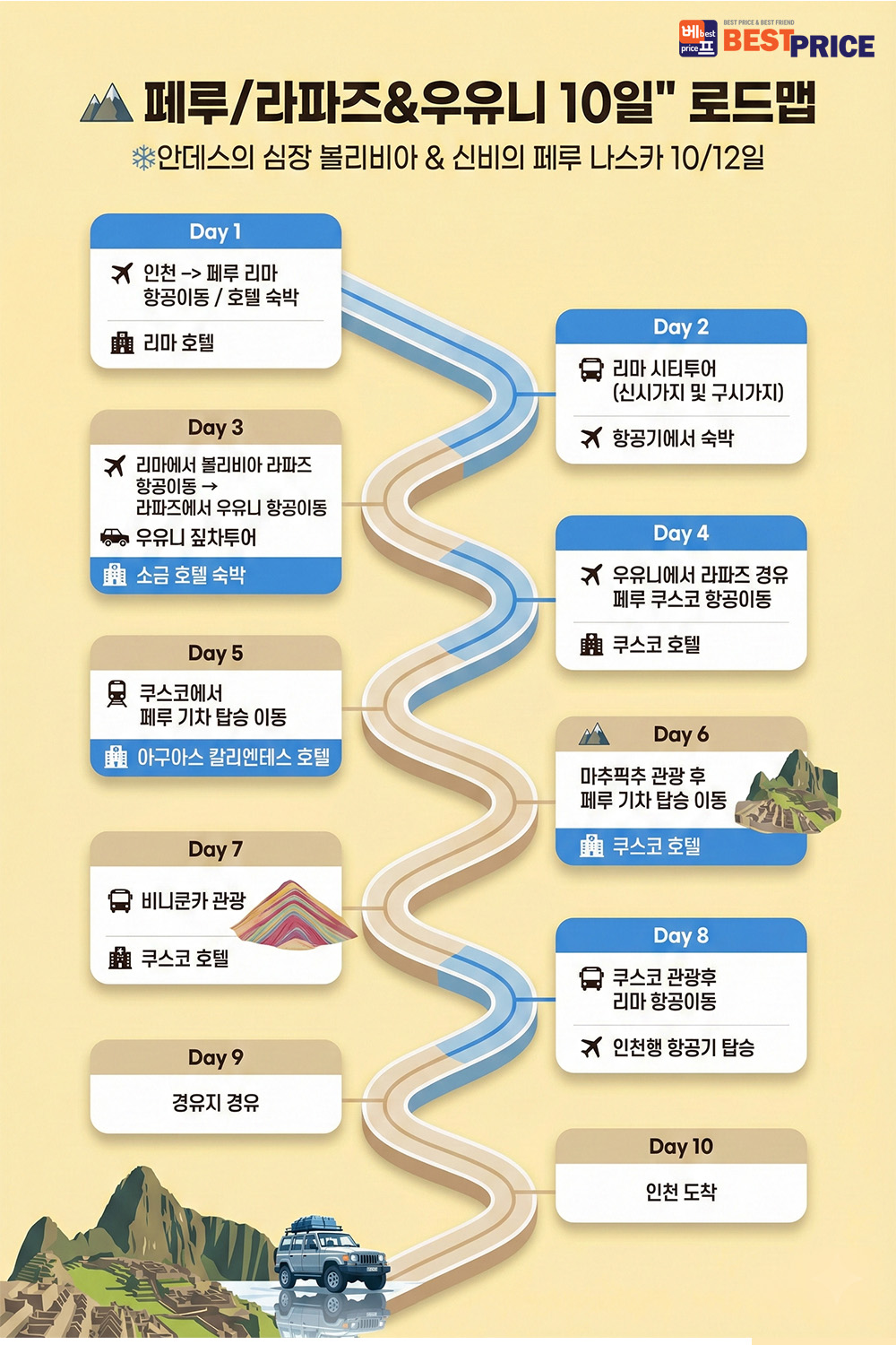 ▶ 장거리 비행과 버스이동 및 고산지대 일정이 있는 상품으로 여행 전 체력/건강상태 등이 충분히 고려되어야합니다.