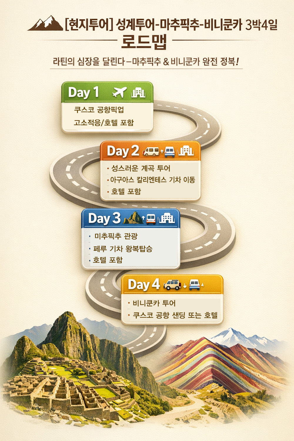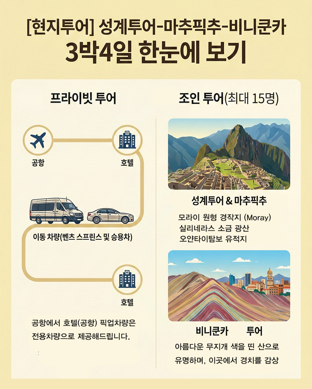 ▶ 장거리 비행과 버스이동 및 고산지대 일정이 있는 상품으로 여행 전 체력/건강상태 등이 충분히 고려되어야합니다.